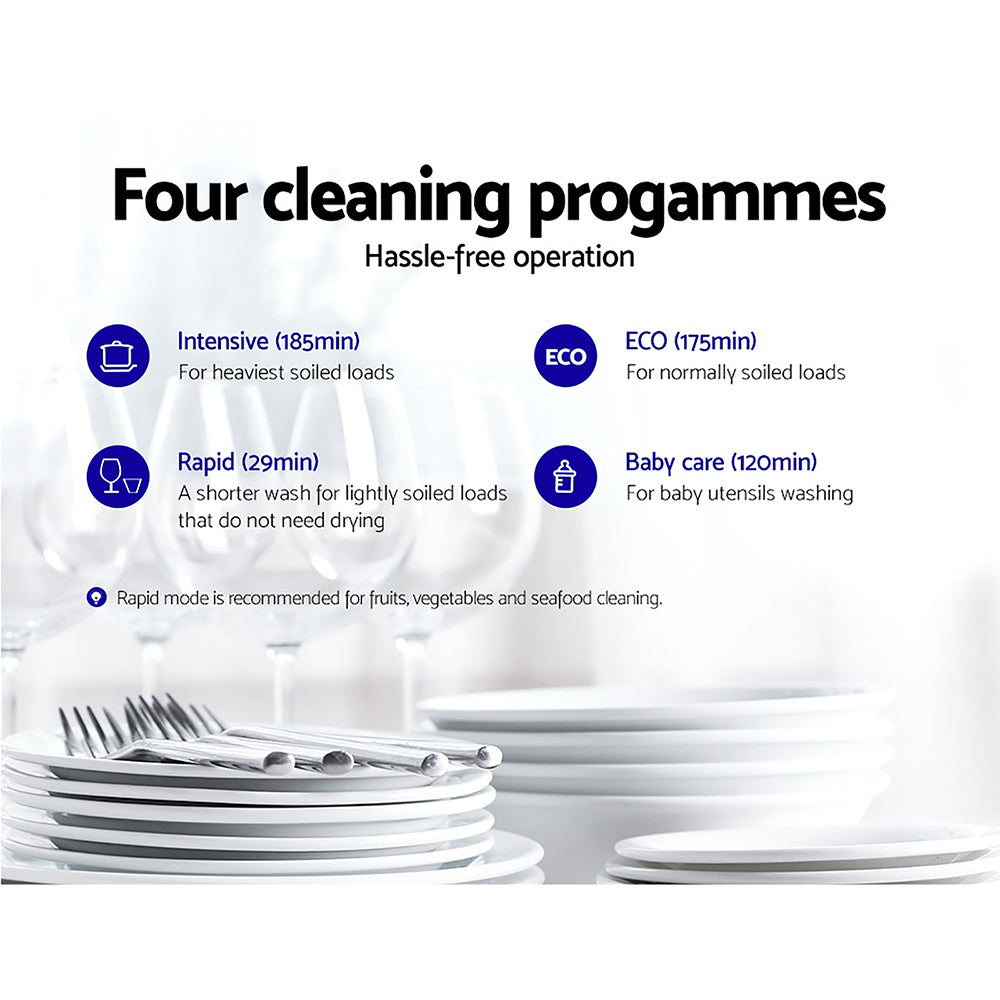 Just like its full-size built-in cousin, the Devanti Benchtop Dishwasher is packed with extraordinary cleaning prowess too. With its convenient LED indicator light and touch controls, operating the dishwasher is hassle-free with up to six washing programmes to choose from. Each programme ensures a thorough 3600 wash with powerful sprays from top to bottom to remove every bit of dirt and food particles. Better still, it is also designed to clean baby bottles and toys safely and hygienically. The dishwasher also enables you to add water in two ways, with a top intake that lets you add water manually without any need for piped water connections. Not least, the automatic ventilation system keeps your washed dishes and utensils clean and dry for up to 72 hours. With many more great features too long to list here, our benchtop dishwasher is certainly the top choice for you when it comes to convenient and effortless dishwashing.