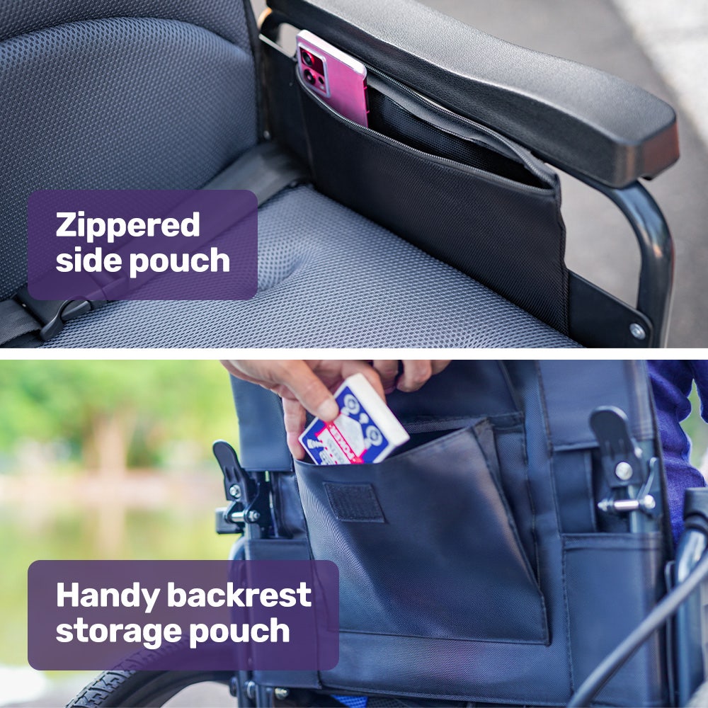 There is a zippered side pocket as well as a reading material pouch behind the backrest. The seat and backrest covers are easily removable and machine washable.