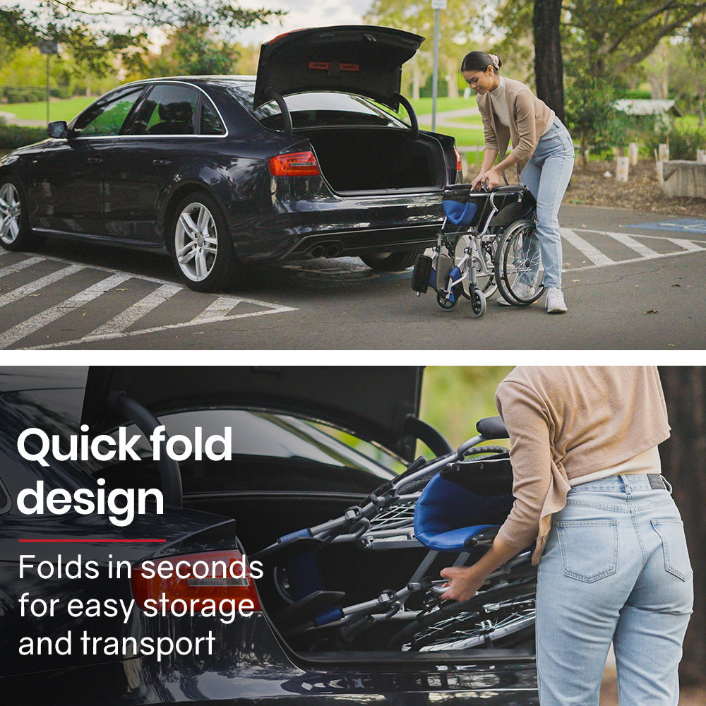 EQUIPMED Folding Aluminium Wheelchair, 20" Wheels, Park Brakes, 100kg Capacity, Blue