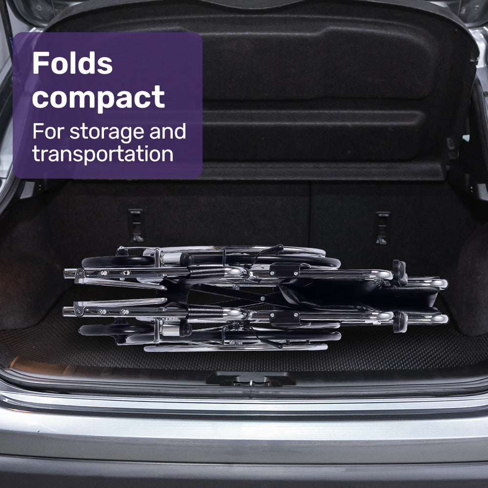 This Equipmed wheelchair features height adjustable footrests that also swing up for easy access onto the wheel chair. Comfy padded armrests and a comfortable seat with a generously proportioned backrest ensure a comfortable ride. And, thanks to the 2 second folding action and ergonomic handles, it makes for a relaxing day out for any helpers, too!