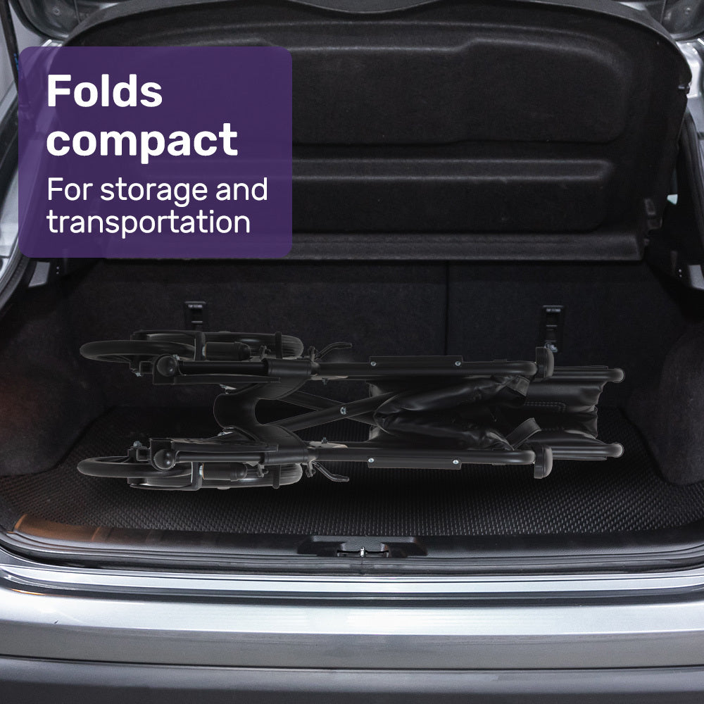The Equimed Transitline XL is a premium folding transport wheelchair with innovative features that make it the smart choice for caregivers seeking convenience, reliability, and comfort. Crafted with a sturdy powder-coated steel frame, this wheelchair is built to last, boasting an impressive 114kg weight capacity.