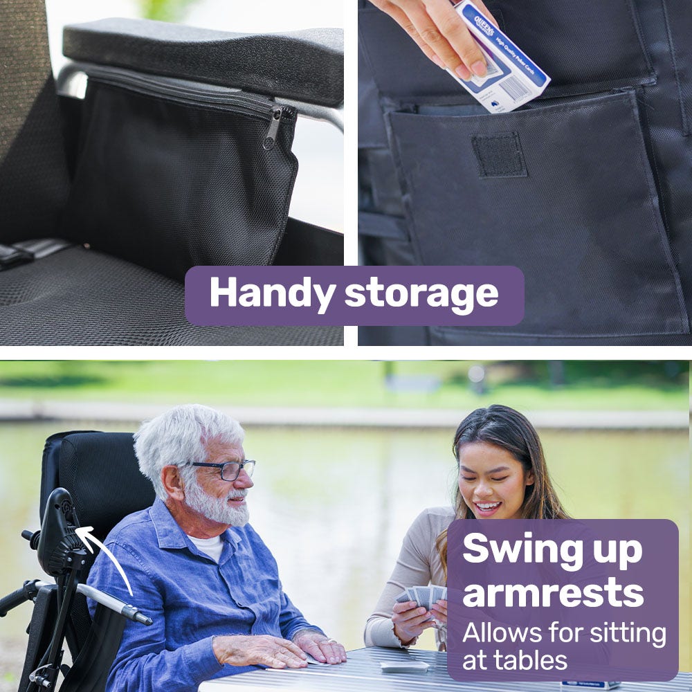 - Easy access and exit with flip-up armrests and fold-up footrests