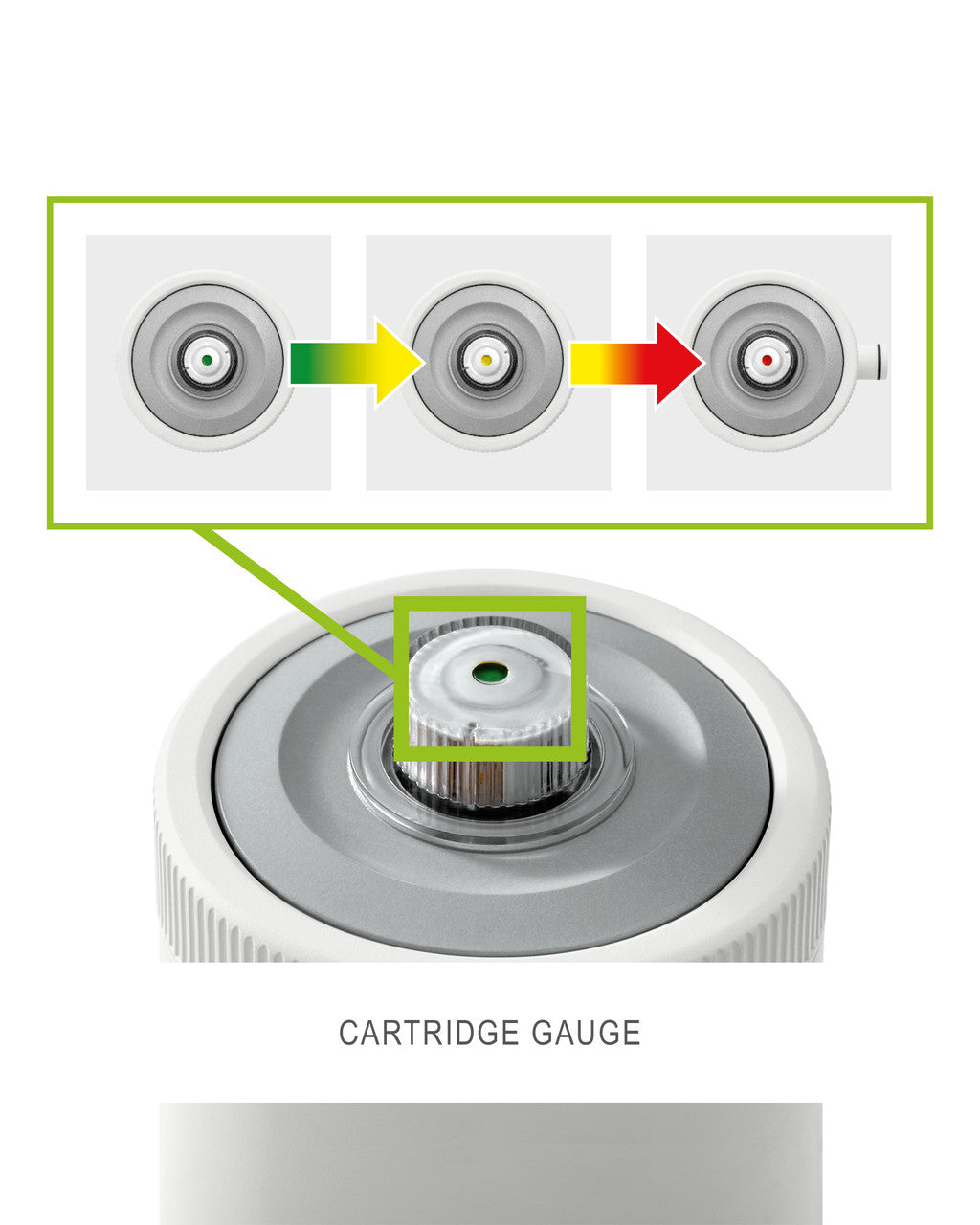 - Cartridge gauge indicator toggles between green, yellow and red so you know when to change your filter