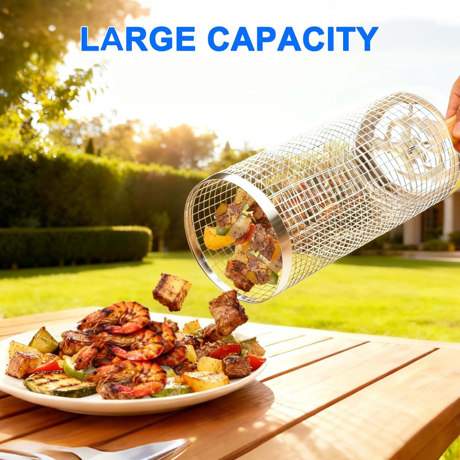 Elevate your outdoor grilling experience with this premium rolling grill basket set. Designed for convenience and performance, these rotating BBQ cages make it easy to cook a variety of foods meat, vegetables, seafood, and more without flipping or turning manually. The 360 rolling design ensures even heat distribution and consistent cooking on all sides, delivering perfectly grilled results every time. Crafted from high-grade 304 stainless steel, the baskets are rust-resistant, durable, and built to withstand high temperatures, making them ideal for charcoal, gas, or wood-fired grills. Each basket features a sturdy mesh structure that allows smoke and flavor to penetrate while keeping food securely inside. The included removable wooden handle stays cool to the touch, so you can safely rotate the basket over hot coals without risk of burns. Whether you're hosting a backyard barbecue, camping, or enjoying a picnic, this set offers space-saving storage and effortless cleanup. The two-piece design includes one large and one medium basket, which nest together for compact storage and portability. Ideal for families, outdoor enthusiasts, and grill lovers who want to simplify their cooking process and enjoy delicious, evenly cooked meals.